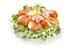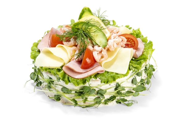 Smörgåstårta garnerad med handskalade räkor, kallrökt lax, salladsblad, ägg, tomat, citron, dill och ärtskott och med en enklare skaldjursfyllning på bland annat räkor, crabfish, ägg, purjolök och dill. (Räktårta med skaldjursfyllning är laktosfri.) Vi beräknar cirka 300gr per bit.