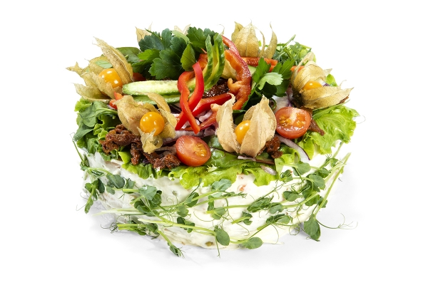 Smörgåstårtan för sällskapet som inte önskar kött eller fisk. Fylld med legymsallad och mimosa, garnerad med sallad, physalis, soltorkade tomater, paprika, tomat, gurka, rödlök, bladpersilja och ärtskott. (Smörgåstårta Vegetarisk är laktosfri)